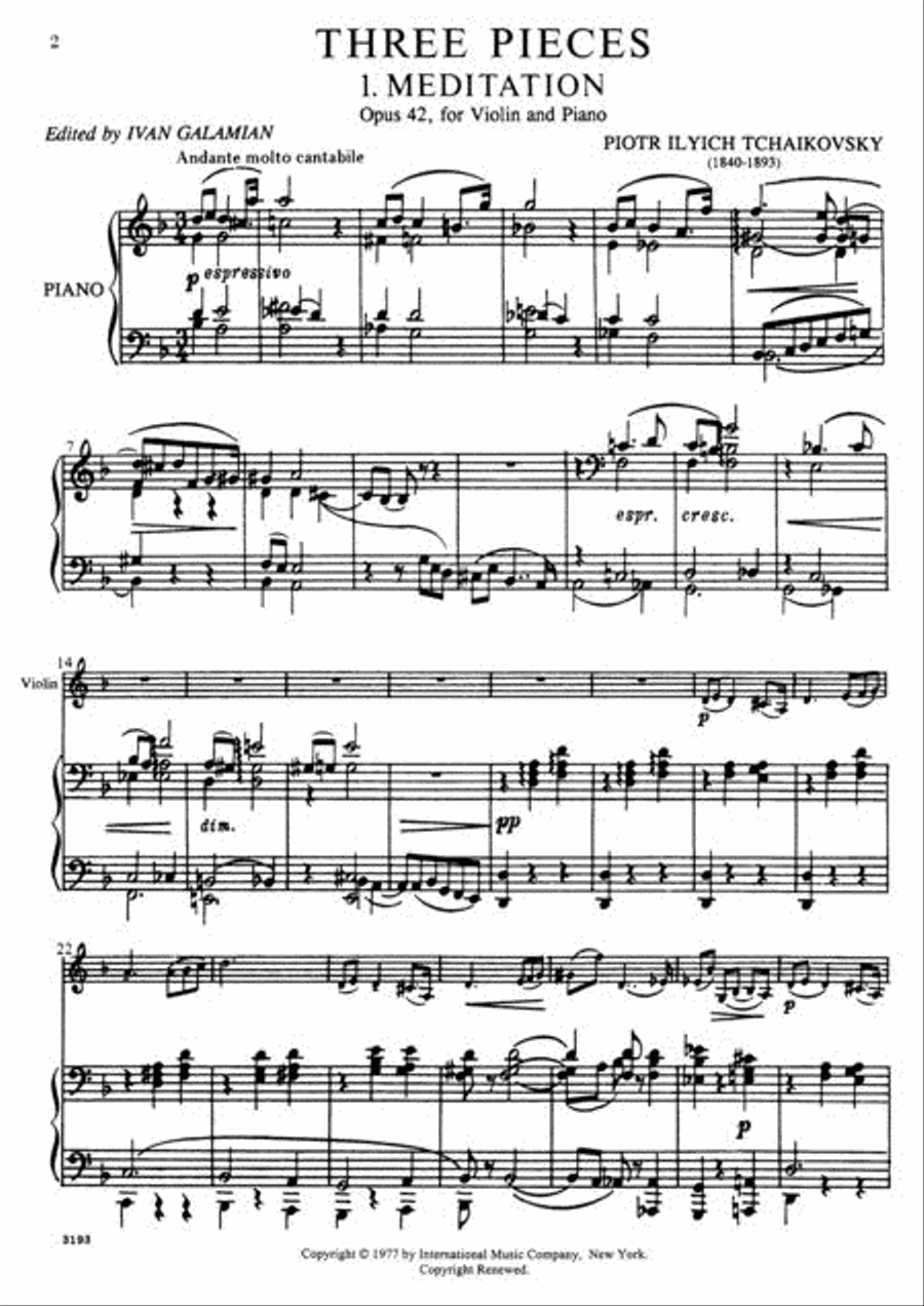 Tchaikovsky 3 Piece Op.42: Meditation, Scherzo, Melodie for Violin and Piano