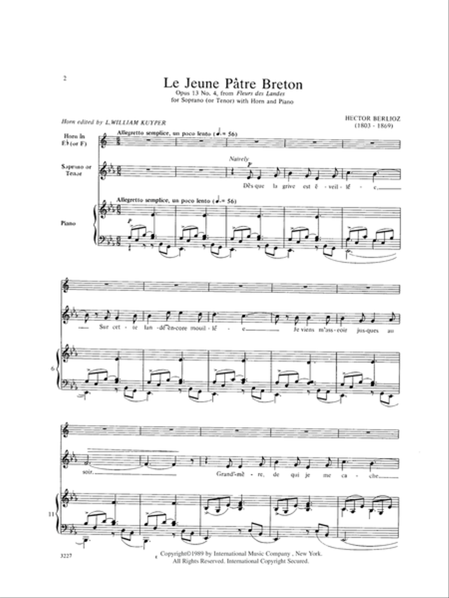 Berlioz Le Jeune Patre Breton, Op.13, No.4. Soprano (or Tenor) with Horn & Piano