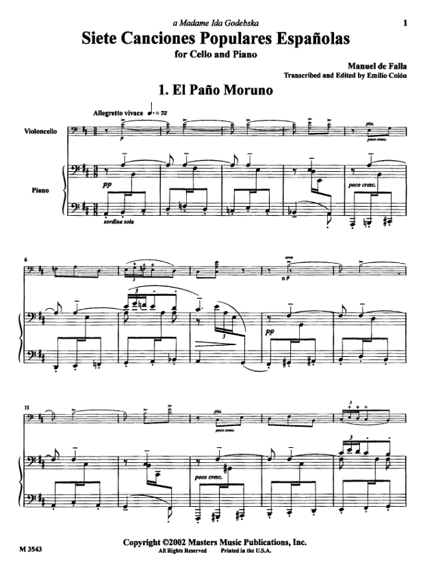 Manuel de Falla(1876-1946)는 원래 소프라노와 피아노를 위해 1914년에 Seven Spanish Folksings를 썼습니다. 첼로와 피아노를 위한 이 필사본은 Emilio Colón이 완성했습니다. 무브먼트: 1. 무어식 천, 2. Seguidilla Murciana, 3. Asturiana, 4. Jota, 5. Nana, 6. Canción, 7. Polo.