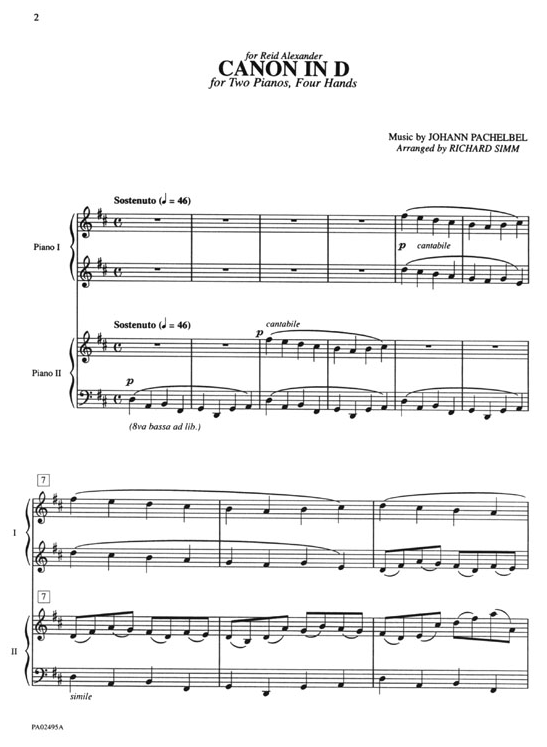 언제나 사랑받는 파헬벨의 캐논 D장조를, 유명한 듀오 편곡가 리하르트 심이 두 대의 피아노, 네 손을 위한 편곡으로 선보입니다. 중상급 후반 수준의 이 편곡에서는 각 피아니스트가 멜로디를 연주할 기회를 갖습니다. 학생들과 듀오 연주자들에게 필수적인 곡입니다. 2024년부터 2028년까지 페더레이션 페스티벌 선정곡입니다.