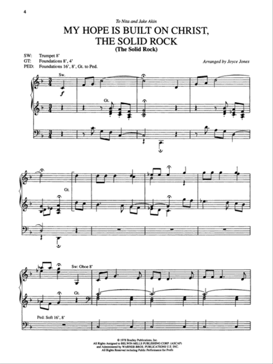 The mastery of Joyce Jones is seen in these moving and exciting arrangements of 14 familiar hymns. Some will require more work than others, but all promise to be inspiring additions to worship services. Any will also make terrific recital selections. Titles include such favorites as Holy, Holy, Holy, Rejoice, the Lord Is King, What a Friend We Have in Jesus and more.