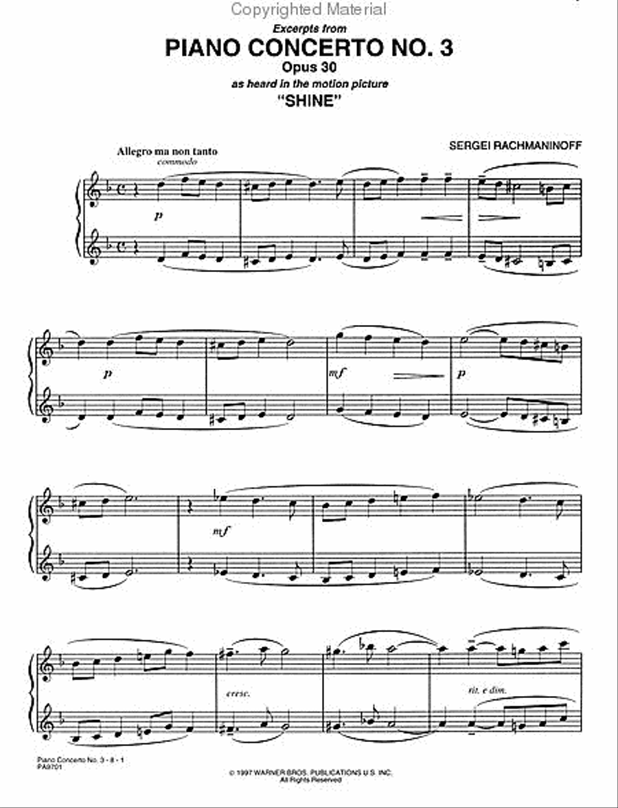 Demands from pianists after seeing the movie "Shine" have brought this excepted piano solo version of the Rachmaninoff "Third Piano Concerto" to life. Taken directly from the cuts used in the movie, you`ll be able to recreate this version at your own piano.