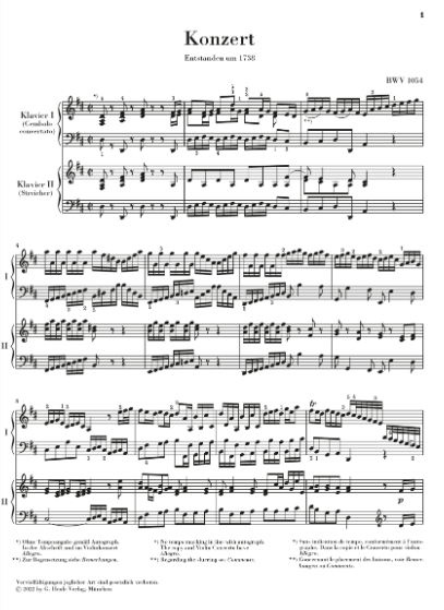 바흐의 매우 인기 있는 하프시코드 협주곡이 원래 바이올린이나 목관 악기를 위해 작곡된 독주 협주곡을 그가 직접 편곡한 것이라는 것을 이들의 연주만으로는 거의 알 수 없습니다. 많은 경우 원래 모델을 알 수 없지만, 1738년 E장조 바이올린 협주곡 BWV 1042를 편곡하여 작곡한 D장조 협주곡 BWV 1054의 경우는 그렇지 않습니다. 바흐는 다시 한번 바이올린 파트에서 훌륭하고 관용적인 건반 작품을 만들어내는 데 성공했습니다. 이 때문만이 아니라 주로 활기차고 명랑한 외부 악장 때문에 BWV 1054는 바흐의 풍부한 작곡 활동의 하이라이트 중 하나로 꼽힙니다. 피아노 축소판은 솔로 파트와 요하네스 움브레이트가 실제 사용을 위해 준비한 매우 연주하기 쉬운 피아노 축소판으로 구성되어 있습니다.
