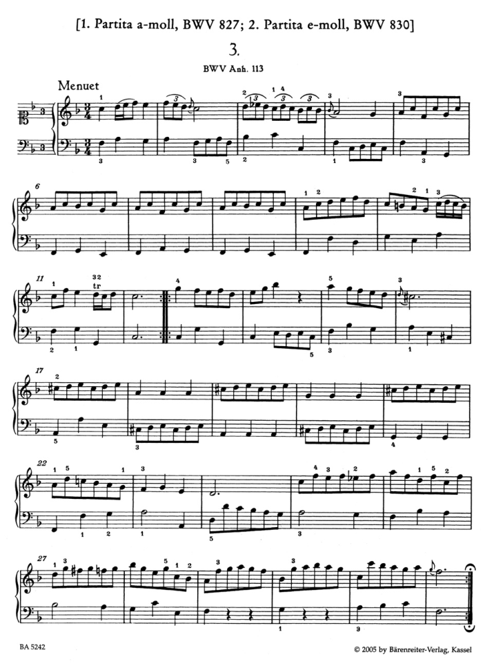 레나테 크레치마르-피셔가 추가한 운지법은 여러 가지 가능한 선택지 중에서 엄선한 것입니다. 이 운지법은 바흐 가족의 소중한 이 악보가 오늘날 피아노 레슨에 여전히 줄 수 있는 영감을 염두에 두고 선택되었습니다. 이러한 점에서, 이 운지법은 손재주, 적절한 성부 진행, 그리고 음악적 구성을 이상적으로 조화시키고자 하는 어린 연주자들에게도 적합합니다.