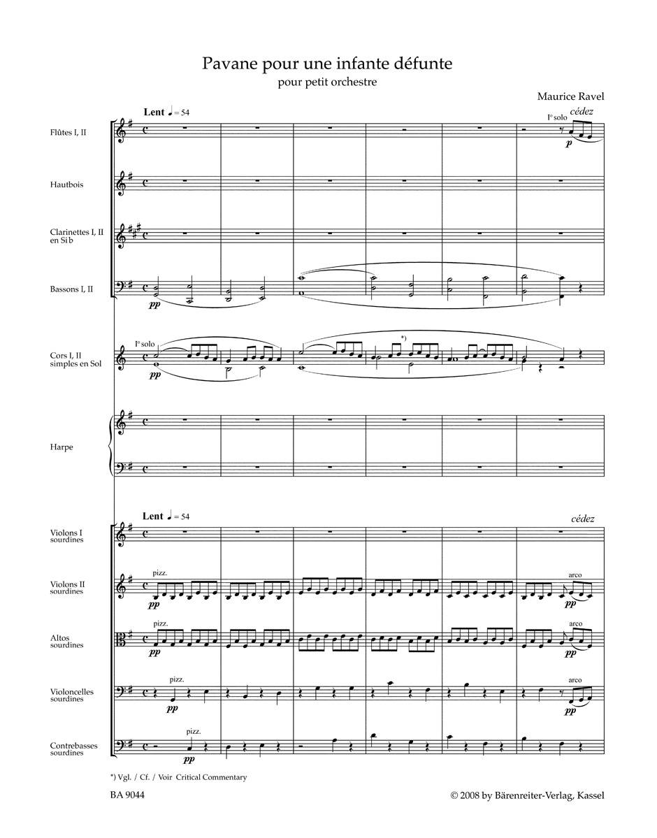 This scholarly-critical edition of the “Pavane” by Regina Back and Douglas Woodfull-Harris takes into account the various reprints of the original piano version, the handwritten score of the orchestral version from 1909 as well as the numerous reprints up to Ravel's death in 1937. In the Foreword, the editors trace the history of the composition. The composer's piano recording and the orchestral recordings made under his direction during his lifetime have also been consulted.