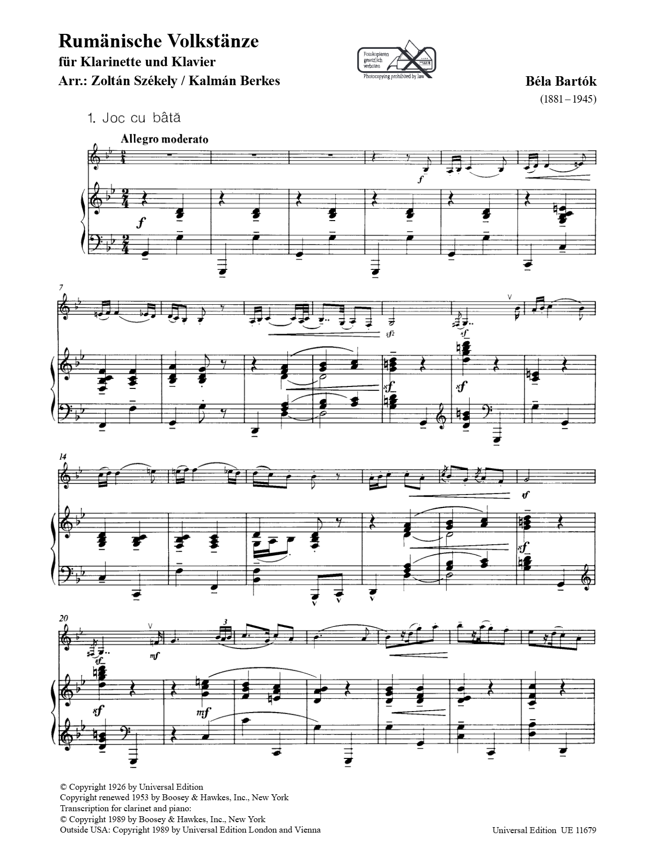 Bartok Rumanian Folk Dances for Clarinet and Piano