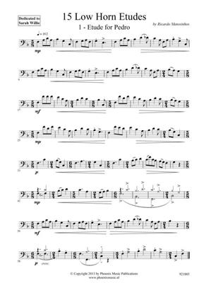 is built on the mixolydian mode, based on major arpeggios separated by one tone and their inversions. Some sections include jumps and sometimes contain a few horn chords. It is very amusing to play.\n\nI hope that you can learn much from 15 Low Horn Etudes, but not less important is that you have fun with them!