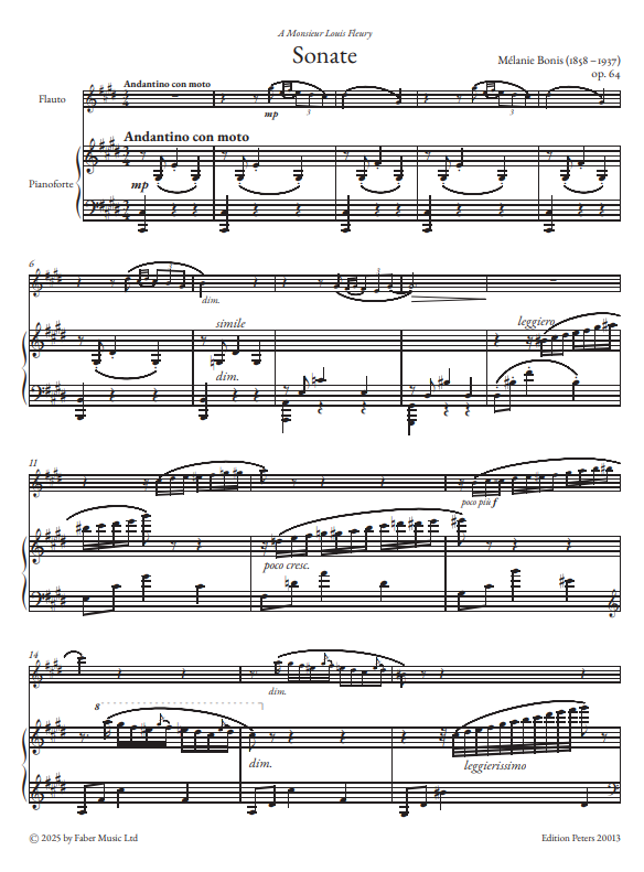 The Sonata for Flute and Piano in C-sharp Minor, Op. 64 by Mélanie Bonis was composed in 1904. Over the course of the 20th century, the Sonata gained recognition and is now considered a staple of the flute repertoire. However, the composer, who often published under the pseudonym Mel Bonis, remains relatively unknown outside France. She studied piano under César Franck alongside Claude Debussy and composition under Ernest Guiraud at the Paris Conservatoire. This Urtext edition seeks to bring greater international attention to the work of this remarkable composer. Presented as a practical edition, it includes a critical commentary from Dr. Wilfried Lingenberg in German, English and French, flute part and piano accompaniment. The piece is 18 minutes long and suitable for intermediate to advanced flautists.
