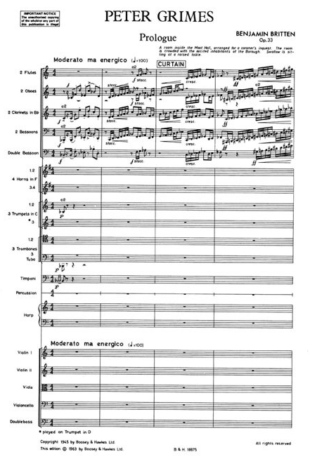 Major roles: S,A,T,Bar; minor roles: 2S,M,2T,Bar,2B,2mimes; chorus 2(=picc).2(II=corA).2(II=Ebcl).2.dbn-4.2.Dtpt.3.1-timp.perc(2):SD/TD/ BD/tamb/tgl/cyms/gong/whip/xyl/rattle-cel-harp-strings Off-stage:organ-bells-tuba* Dance band on-stage*:2cl-perc:cym/SD/BD-pft(ad lib)-vln.db (*taken from the orchestra)