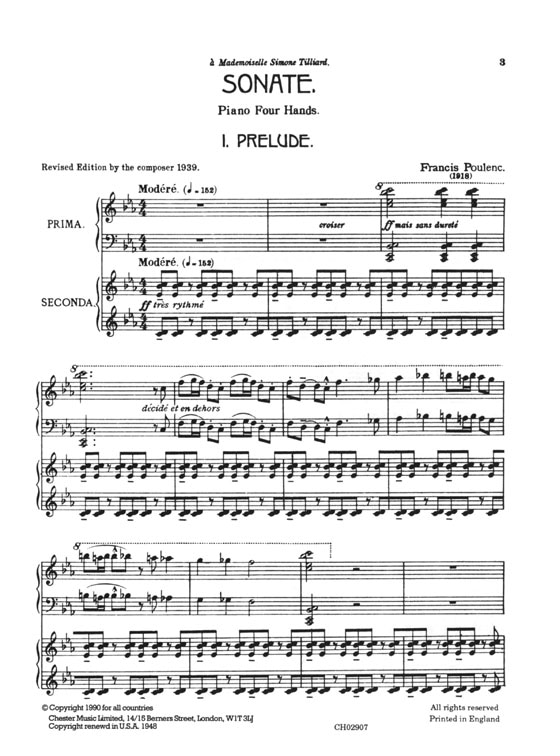 This French composer and pianist was one of Les Six, a group of French composers who subscribed to the aesthetic ideals of Erik Satie. The spontaneity and lyricism of Poulenc's style are best adapted to small forms such as thisterrific sonata for piano duet.
