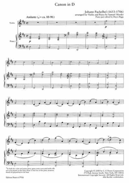 In the present arrangement, Pachelbel's note values have been doubled for greater ease of reading, and the work's canonic structure has been somewhat modified in order to make it more readily playable by violinists and pianists at an intermediate level. Since dynamics, bowing indications, articulations, and slurs were not customarily provided by composer of the Baroque era, the arranger and the editor have added them here, as well as a metronome indication and a few cadential trills. These editorial additions should be regarded only as suggestions.