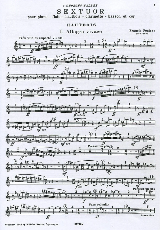 Poulenc Sextet for Piano, Flute, Oboe, Clarinet, Bassoon, horn (Score and Parts)