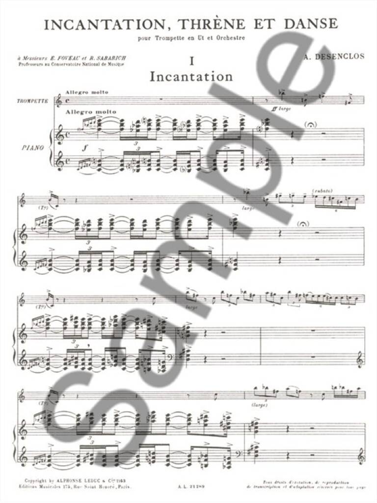 Incantation, thrène et Danse는 Alfred Desenclos가 파리 음악원 콘테스트를 위해 쓴 작품입니다. E. Foveau와 R. Sabarich라는 두 교수에게 헌정된 이 트럼펫과 피아노를 위한 곡은 고급 기술, 테크닉, 인내력이 필요합니다. Incantation, Threne et Danse의 세 부분으로 구성되어 있으며, 각 부분은 먼저 피아노로 시작하고 이어서 트럼펫으로 연결됩니다. 난이도는 샤프 4개, 플랫 6개까지 키가 바뀌고, 리듬과 템포가 상당히 까다롭습니다. 난이도는 8로 설정되어 있습니다. 알프레드 데센클로(Alfred Desenclos, 1912-1961)는 1942년 로마상을 수상한 프랑스 작곡가입니다. 그는 '메세 드 레퀴엠' 등의 미사곡을 더블베이스, 하프, 플루트, 트럼펫 또는 프렌치 호른.