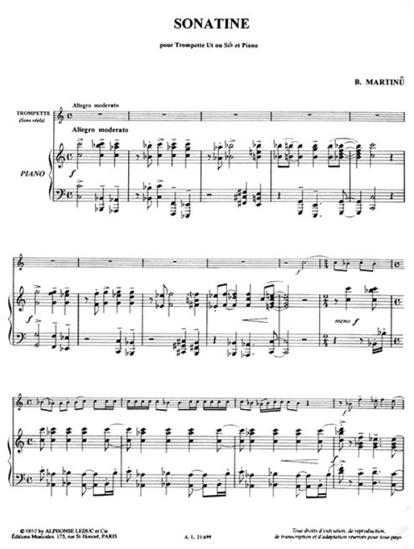 Bohuslav Martinu (1890-1959) was a prolific Czech composer, writing many large scale works. The composer moved to Paris in 1923 where he began experimenting in a variety of composition styles. Sonatine for Trumpet and Piano was composed in 1957 and is adaptable to both the B flat and C Trumpet. Martinu himself was a violinist but he liked to experiment and the mid-1950s saw him move to Nice in France, where he began writing Sonatas for wind and brass. Sonatine for Trumpet exemplifies the composer's influence of Stravinsky, Debussy and jazz music. The piece is excitingly virtuosic in its use of flutter tonguing, complex rhythms, chromaticism, and ensemble between the Trumpet andPiano. As a varied, substantial work for the Trumpet repertoire, Martinu 's Sonatine is essential to the advanced trumpeter.