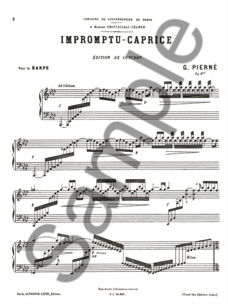 Gabriel Pierné (1863-1937) was a French composer, conductor and organist. Despite being predominantly remembered as a conductor, his Impromptu-Caprice remains a popular performance piece in the advanced harpists' repertoire.Pierné studied at the Paris Conservatoire before taking up the position of chief conductor for the concert series, Concerts Colonne in 1910. He remained in the post until 1933, and during this time, he notably conducted the worldpremiere of Igor Stravinsky's The Firebird. Pierné composed for a variety of instruments, Impromptu-Caprice being one of four solo works by the composer. This Pierné piece for harp contains many characteristics typical of theFrench style, such as significant tempo changes, flourishes of semiquavers and many alterations in dynamics. Impromptu-Caprice is a varied piece essential to the repertoire of aspiring harpists.