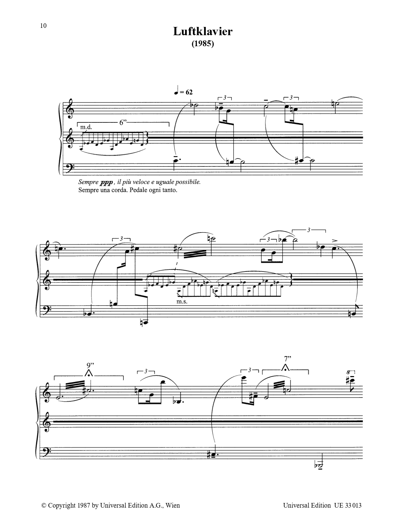In order to become familiar with a composers works, its best to consider his compositions chronologically. On the one hand this helps to recognize fundamental structures, and on the other, to determine changes and developments. Luciano Berios 6 Encores are ideal for such an approach. The six short pieces were composed in the years between 1965 and 1990 and reflect very different moments of Berios piano music. As can be assumed from the titles: Wasserklavier, Luftklavier, Erdenklavier etc., the composer uses a different harmonic structure for each work and a continually changing piano technique to ensure each work has an effect of its own. Nevertheless, the cyclic character of all these little pieces becomes evident especially from Berios unequivocal formal references to other piano works (e.g. Concerto per due pianoforti, Points on the curve to find, Echoing curves, Sequenza IV). Experienced musicians appreciate the 6 Encores as the icing on the cake of a successful piano evening and for young players, they are an ideal introduction to new music.