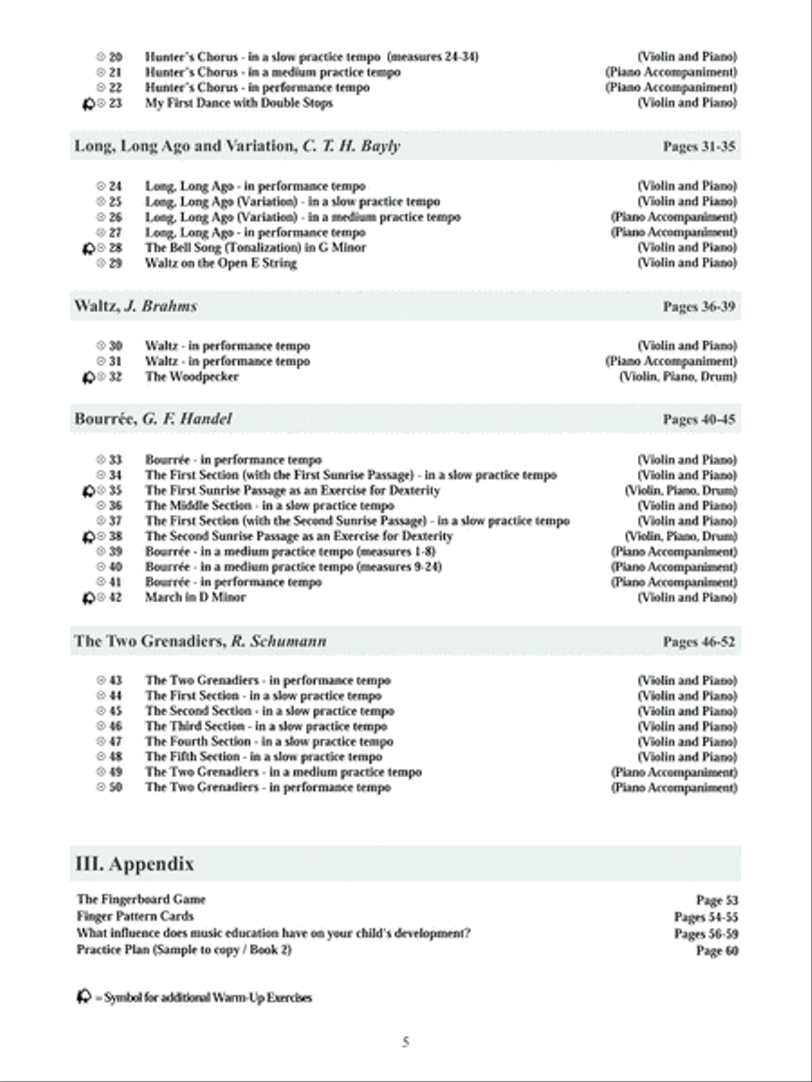 The Step by Step series is a collection of exercise books/recordings for violin based on the Mother-Tongue approach. From the very beginning, it will provide a solid foundation in instrumental technique for Suzuki and traditional approaches in private lessons or group settings. The focus is on teaching correct, child-appropriate practice habits that range from listening, singing, and dancing to playing music. The ideas presented, including information for parent and practice tips should stimulate daily practice and also make it more effective. Includes new piano arrangements by David Andruss. This volume is the Complete Version based on Suzuki Violin School, Volume 2, and includes the Violin Exercise Book in English with the recording