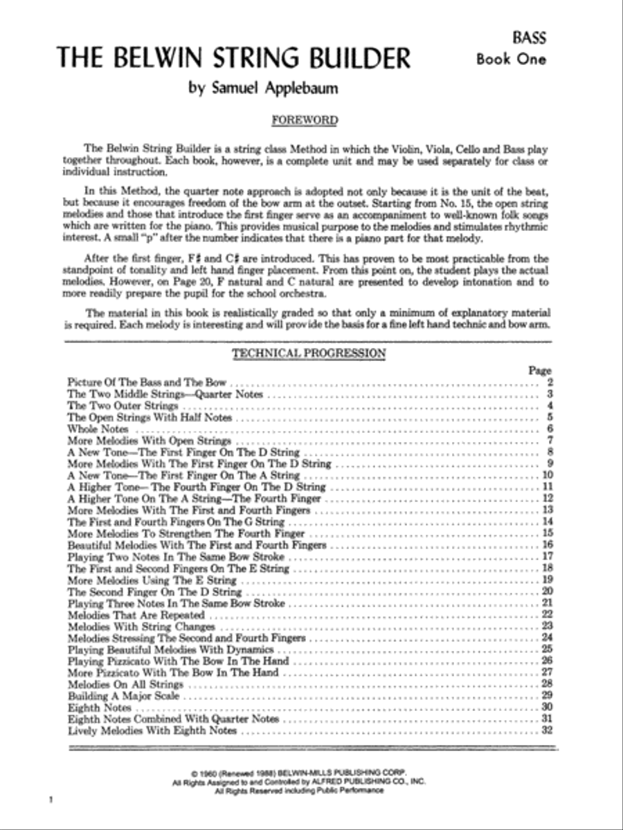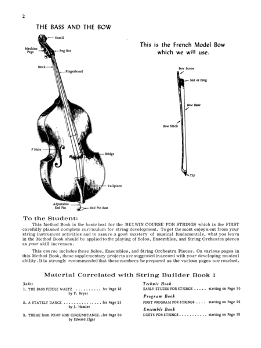 The Belwin String Builder is a string class method in which the violin, viola, cello, and bass play together throughout. Each book, however, is a complete unit and may be used separately for class or individual instruction. The material in this book is realistically graded so that only a minimum of explanatory material is required. Each melody is interesting and will provide the basis for a fine left hand technic and bow arm. Available in three levels for violin, viola, cello, bass, piano accompaniment, and teacher`s manual.