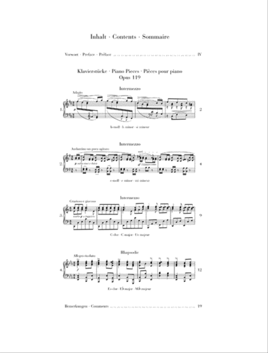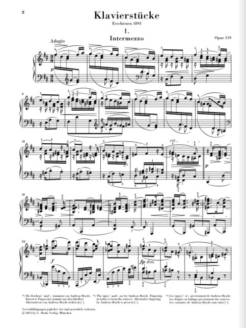 Fingering by Andreas Boyde Johannes Brahms' summer sojourn in 1893 in Bad Ischl was productive. Alongside the pieces op. 118, he also wrote his last cycle of piano pieces, opus 119. The composer wrote to Clara Schumann of the opening work, saying that it was teeming with dissonances and that: “every measure and every note must sound like a ritardando, as if one wanted to suck the melancholy out of each single one, with lust and pleasure out of the aforementioned dissonances!” Yet opus 119 contains something for every mood: No. 3 surprises with its lively and light C major, and the cycle is completed with the defiant rhapsody in E flat major. Our revised edition, based on the Brahms Complete Edition, is an invitation to pianists to rediscover Brahms' complex cosmos.