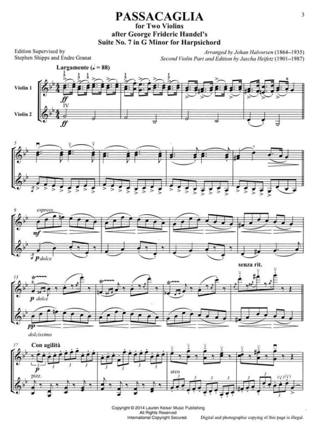 Handel - Halvorsen Passacaglia for 2 Violins (Score and Parts)