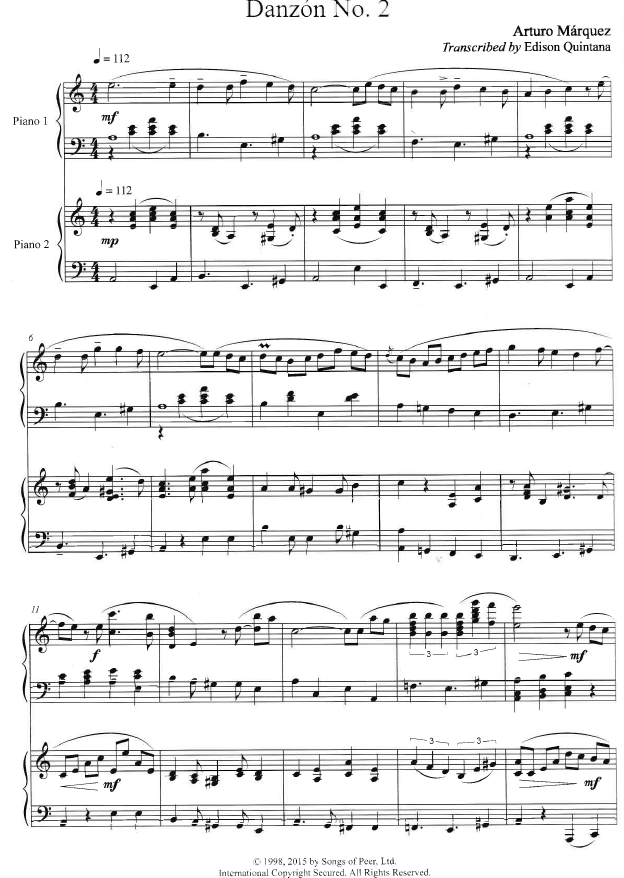 Marquez Danzon No.2 for 2 Pianos 4 Hands with Optional Percussion (2 set)