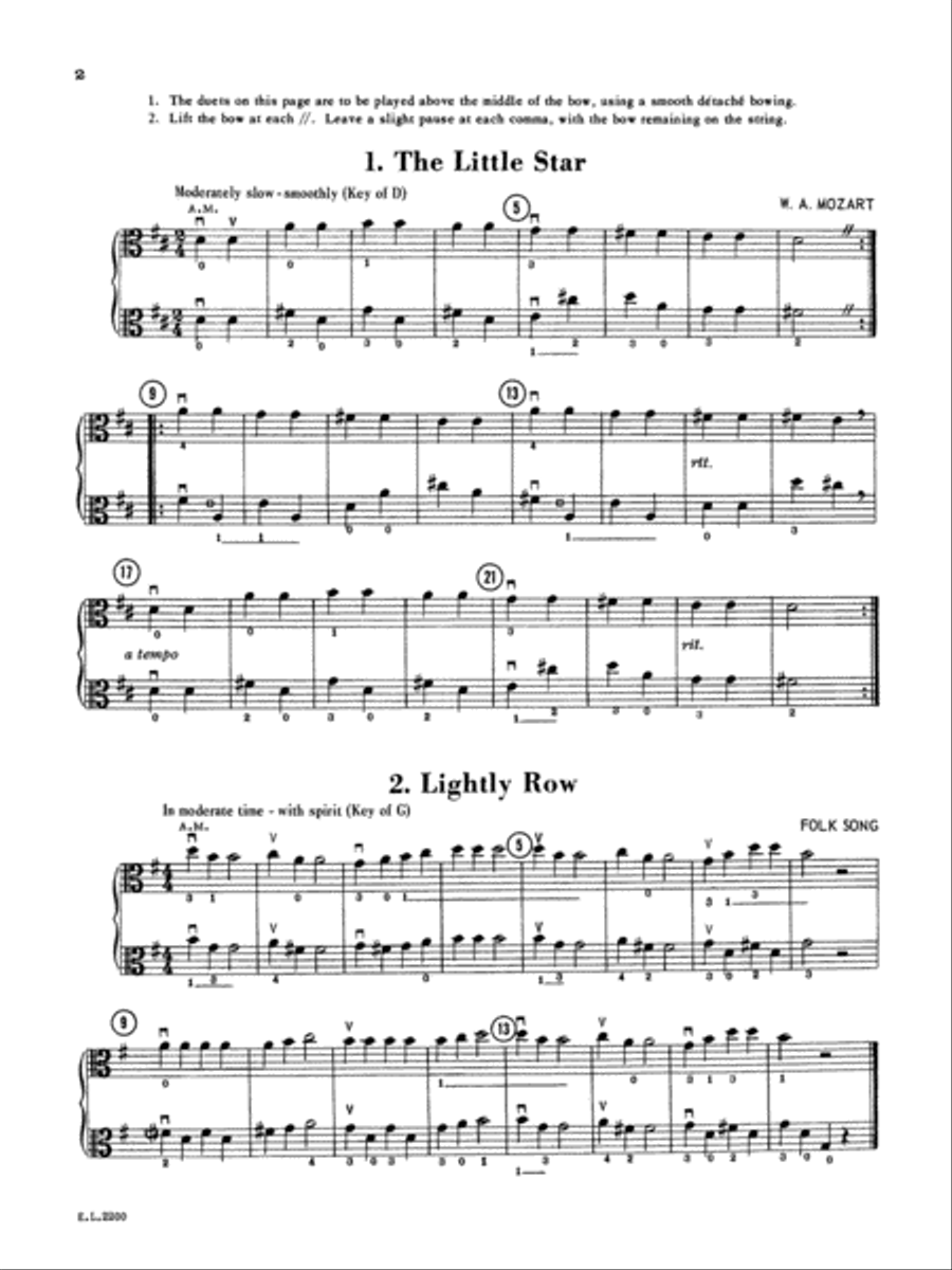 The study of string instruments should include ensemble playing at the earliest possible stage. There is much to be gained from the playing of duets. Each player learns how to listen to the other, and in a short time develops an awareness of balance, musical phrasing, intonation, and tone quality. This type of training is excellent preparation for participation in large groups. These four volumes of duets for two violins will help fill the need for early ensemble experience in the public schools. They should be used in string classes as a supplement to any of the standard string methods. They will also encourage music making outside of the school, with parents or with other students. These duets are ideal for recitals in the public schools and in public school festivals. They may be played by two performers, or by multiple performers on each part, with or without piano accompaniment.