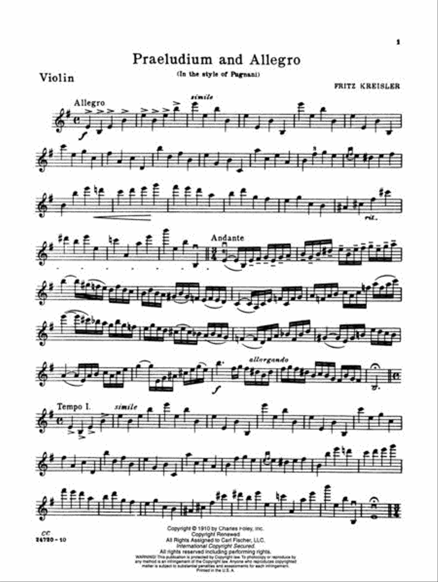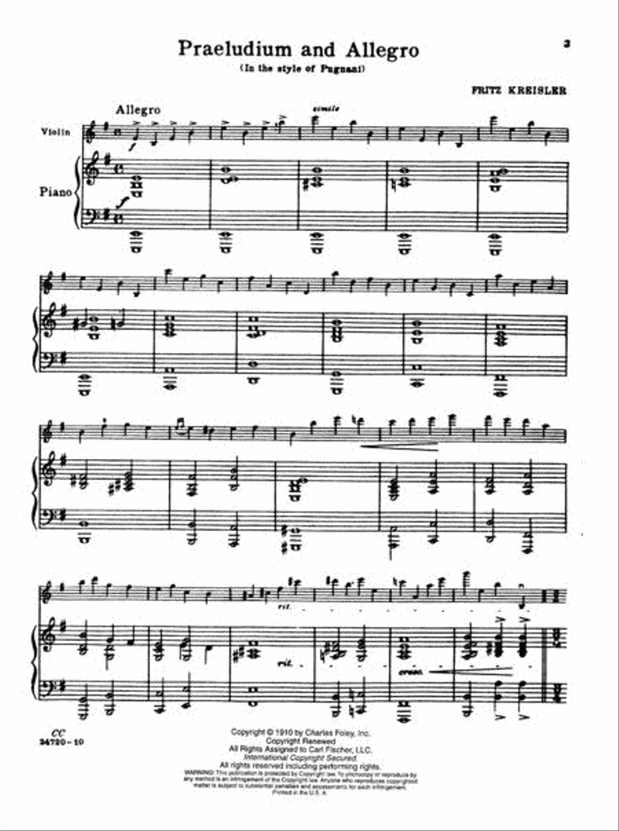Kreisler Praeludium (Prelude) and Allegro in Style of Gaetano Pugnani for Violin and Piano