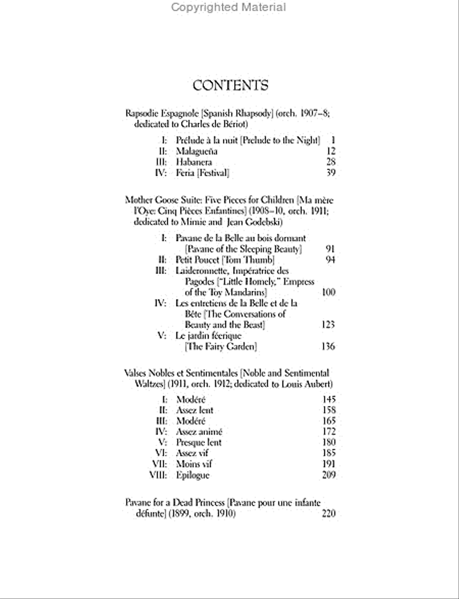 Similarly, Ravel recast his brilliant 1911 piano composition Valses Nobles et Sentimentales as an orchestral score in 1912 (a ballet based on its premiere that year in Paris) and arranged his evocative 1899 piano work Pavane for a Dead Princess for orchestra in 1910. The rich orchestral settings of all four works have made them popular favorites on concert stages worldwide. This superbly prepared edition brings together in one volume authoritative full scores of these four works, reprinted from original French editions