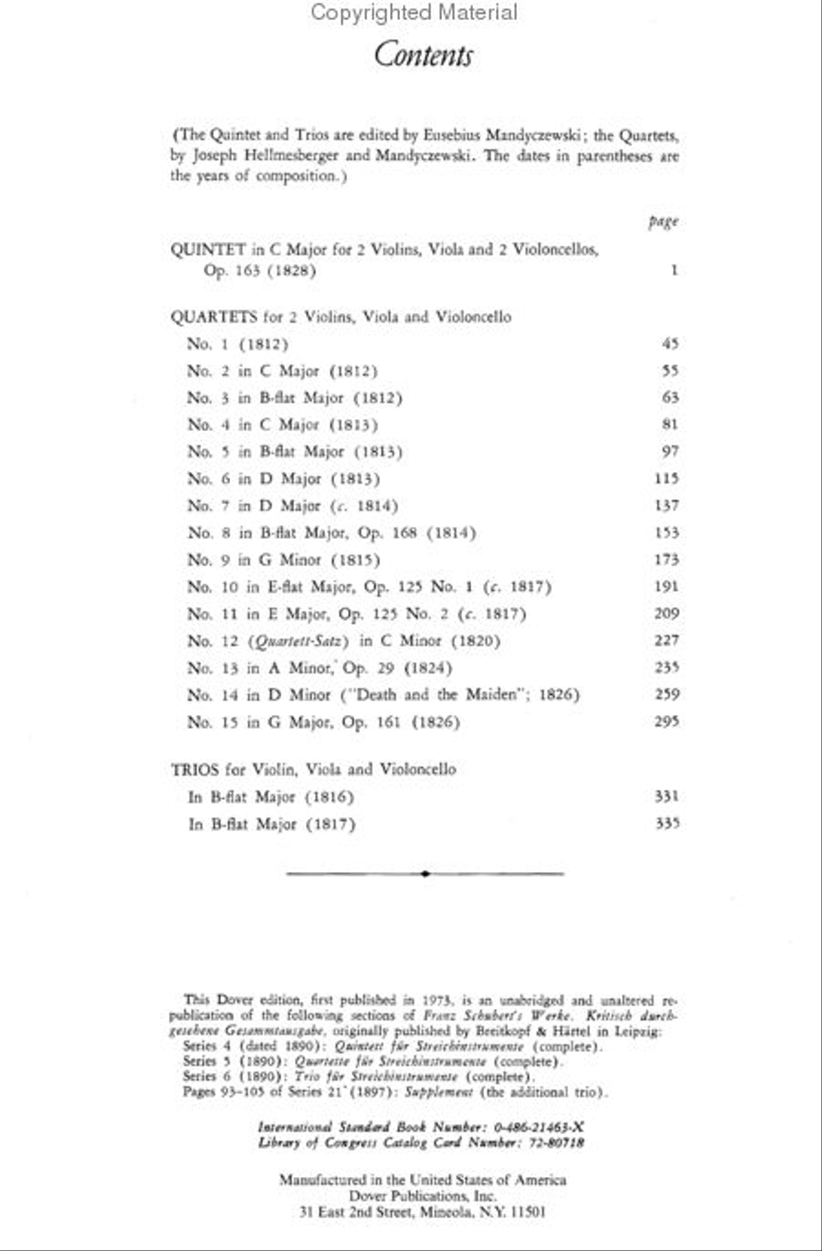 This volume is reproduced directly from the famous Breitkopf & Härtel series published at Leipzig under the title Franz Schubert's Werke, Kritisch durchgesehene Gesammtausgabe. The music is edited by Eusebius Mandyczewski and Joseph Hellmesberger. Included are the Quintet in C Major (1828), the 15 quartets, and two trios for violin, viola, and violoncello.