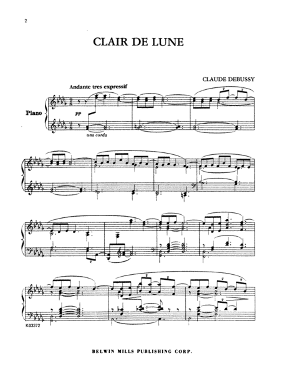 The original, unedited, unsimplified version of one of Debussy's most popular piano works. This ethereal, flowing section of Suite Bergamasque is diatonic and displays a conventional harmonic vocabulary in D-flat major. The title, Clair de lune, suggests a relationship to Paul Verlaine's eponymous poem, describing a vision of long-dead dancers in the moonlight. The music transmits the otherworldly, transparent, and impalpable qualities of the experience while maintaining clarity and definition. Perfect for the burgeoning late intermediate pianist.