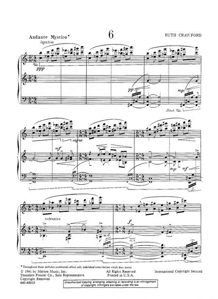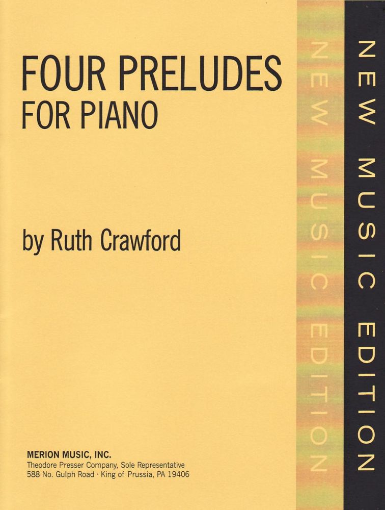Four preludes--Nos.6,7,8 and 9--from a large group first published in the New Music Edition. They exhibit Ruth Crawford's earthy, uncompromising use of dissonance coupled with her well- defined musical forms and her sensitivity to piano "color". The melodies lie as diamonds embedded into the rock-like textures that surround them. In fact, in Prelude No.7, Crawford has seen fit to indicate the "melodic line" over the music itself. 1981 piano competition, studios,colleges, libraries, professional. Medium difficult.