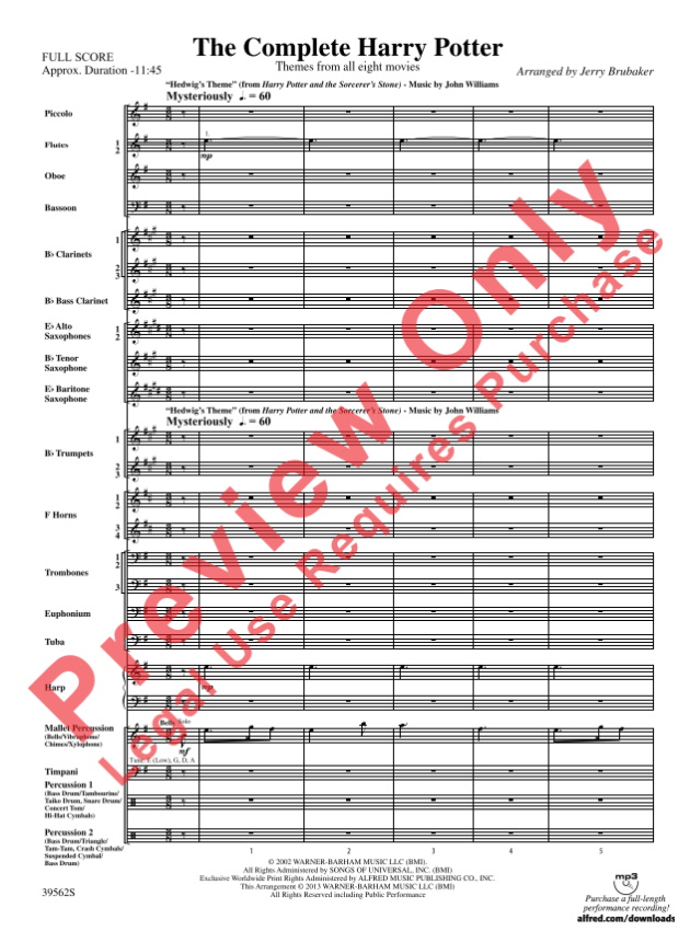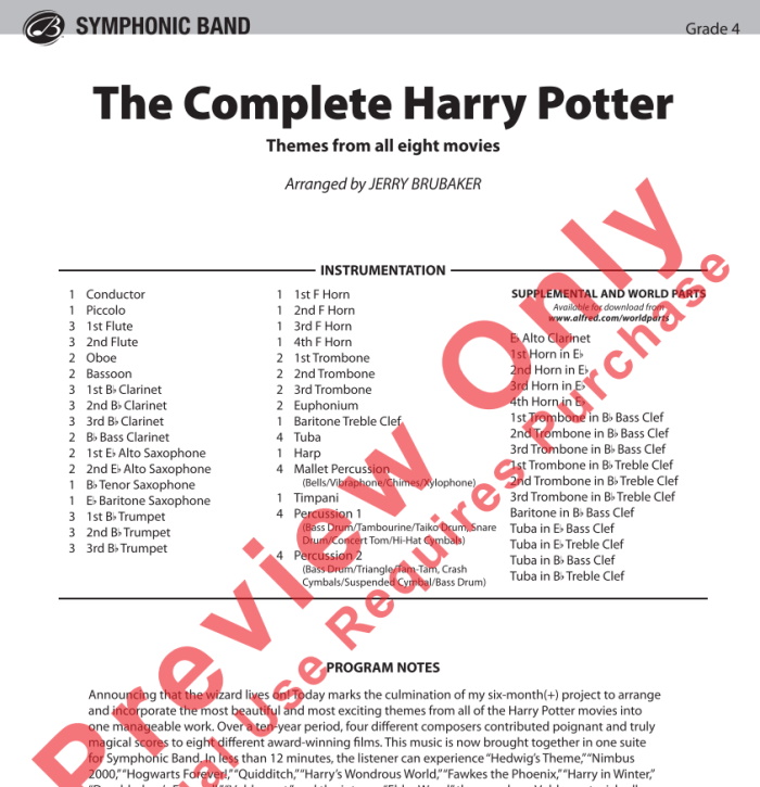 The wizard lives on! Some of the most beautiful and exciting themes from all of the Harry Potter movies are beautifully arranged into one manageable work. Over a ten-year period, four different composers contributed poignant and truly magical scores to eight award-winning films. In less than 12 minutes the listener can experience "Hedwig's Theme," Nimbus 2000," "Hogwarts," "Quidditch," "Harry's Wondrous World," "Fawkes the Phoenix," "Harry in Winter," "Dumbledore's Farewell," "Voldemort," and the intense "Elder Wand" theme where Voldemort wickedly thrusts Dumbledore's Wand to the sky! More themes abound including the mysterious "Lily's Theme," "The Friends," "The Weasly Stomp," and "Obliviate." A fitting finale, John Williams' compelling "Family Portrait" theme is used in the finale of the final film to send off future wizards as they board Hogwarts Express! (11:45)