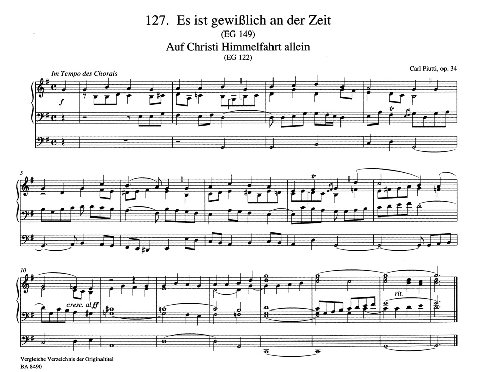 Carl Piutti (1846–1902) was a teacher at the Leipzig Conservatory and an organist at St. Thomas ’s in Leipzig . He wrote many organ pieces in a late-romantic vein, including Two Hundred Chorale Preludes for Organ, op. 34. These organ preludes were among the most frequently heard liturgical organ music of the late 19th century. Their mixture of chorale elaboration, melodic figuration, striking harmony, toccata-like virtuosity and imitation was never an end in itself, but always subservient to the essence of the underlying hymn tunes.