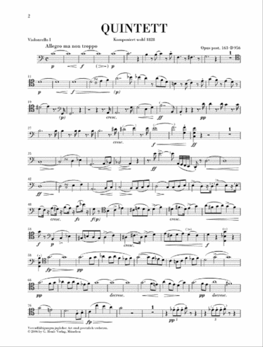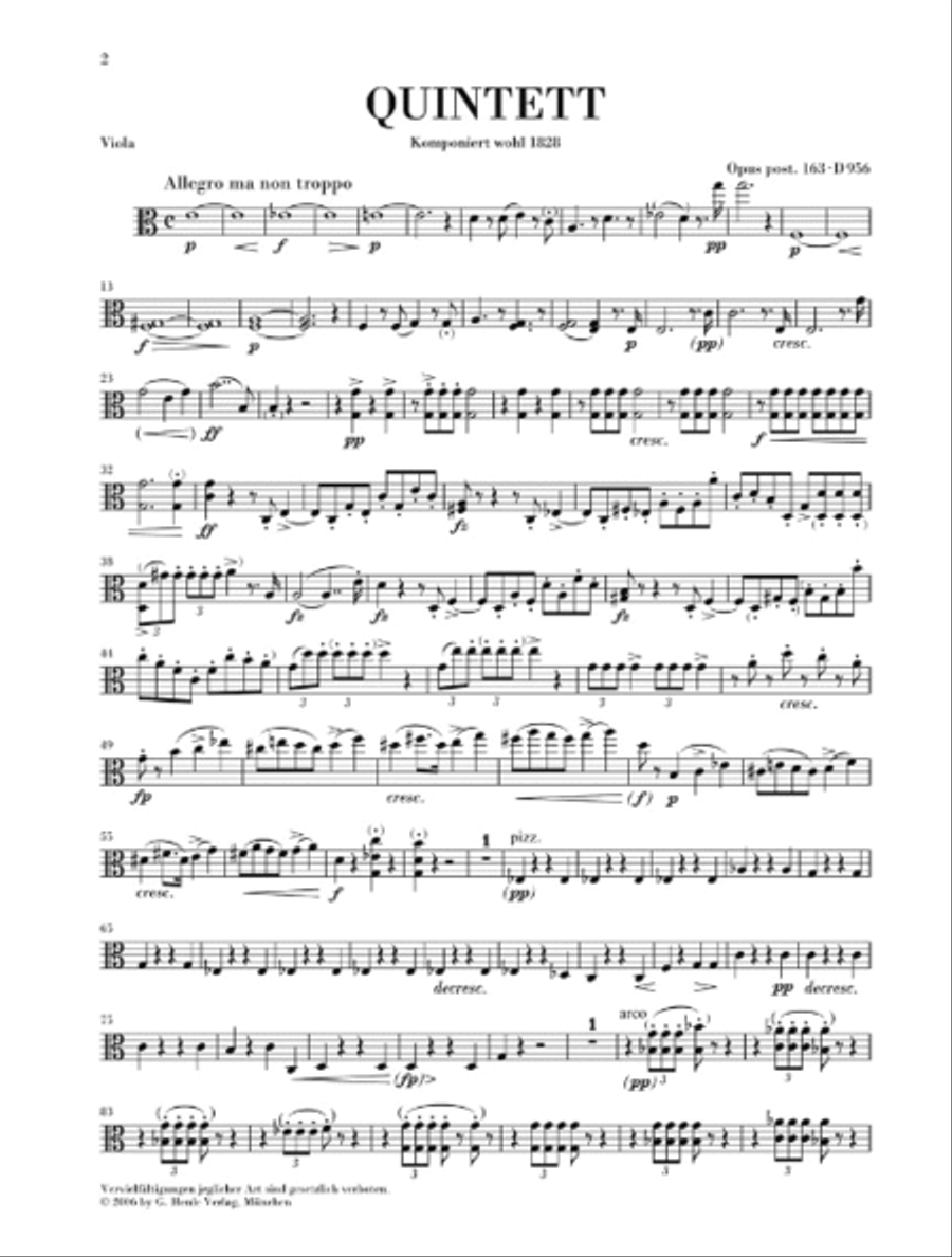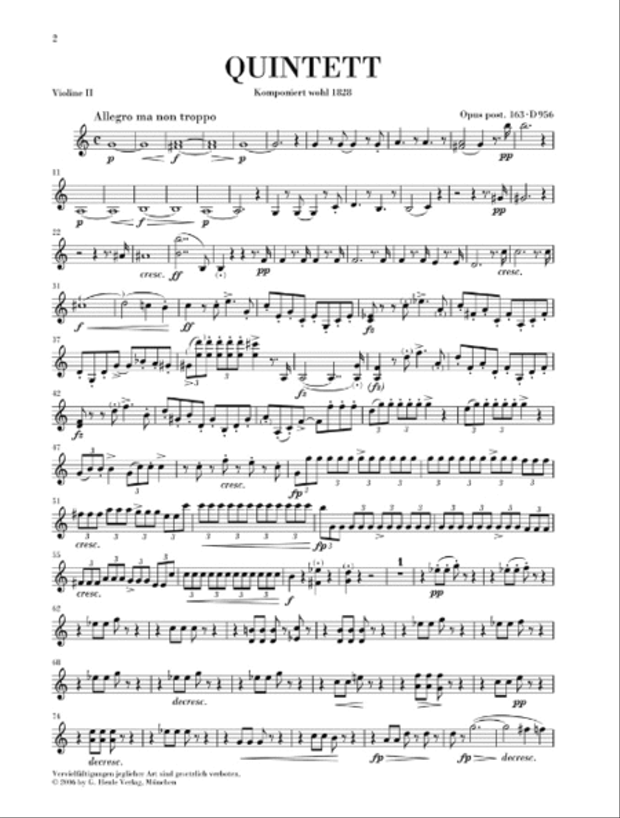 슈베르트 생애 마지막 해에 작곡된 이 작품의 감정적 깊이에 음악 애호가라면 누구나 감동하지 않을 수 없을 것입니다. 외주 악장의 장엄한 무게감, "아다지오"의 은은한 서정성, 그리고 독특한 음색은 이 5중주의 독창성을 보장합니다. 핵심적인 선율적 역할을 하는 첼로가 추가되어 클래식 현악 4중주에 합류합니다. 새로운 원전판 편집자 에곤 보스는 이 어려운 악보의 상황을 잘 표현했을 뿐만 아니라, 어려운 악장 넘기기에 대한 새롭고 설득력 있는 해결책을 제시하며 음악 연습의 요구 사항까지 고려했습니다.