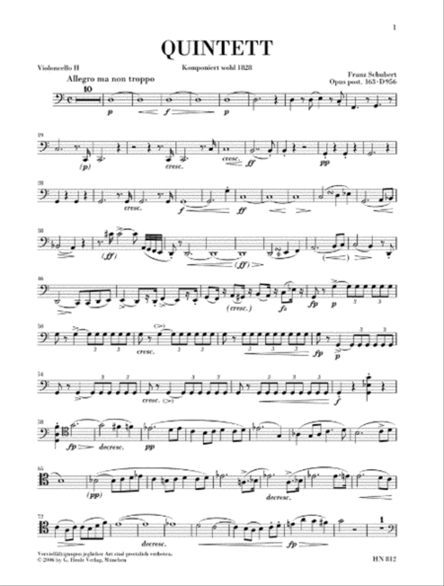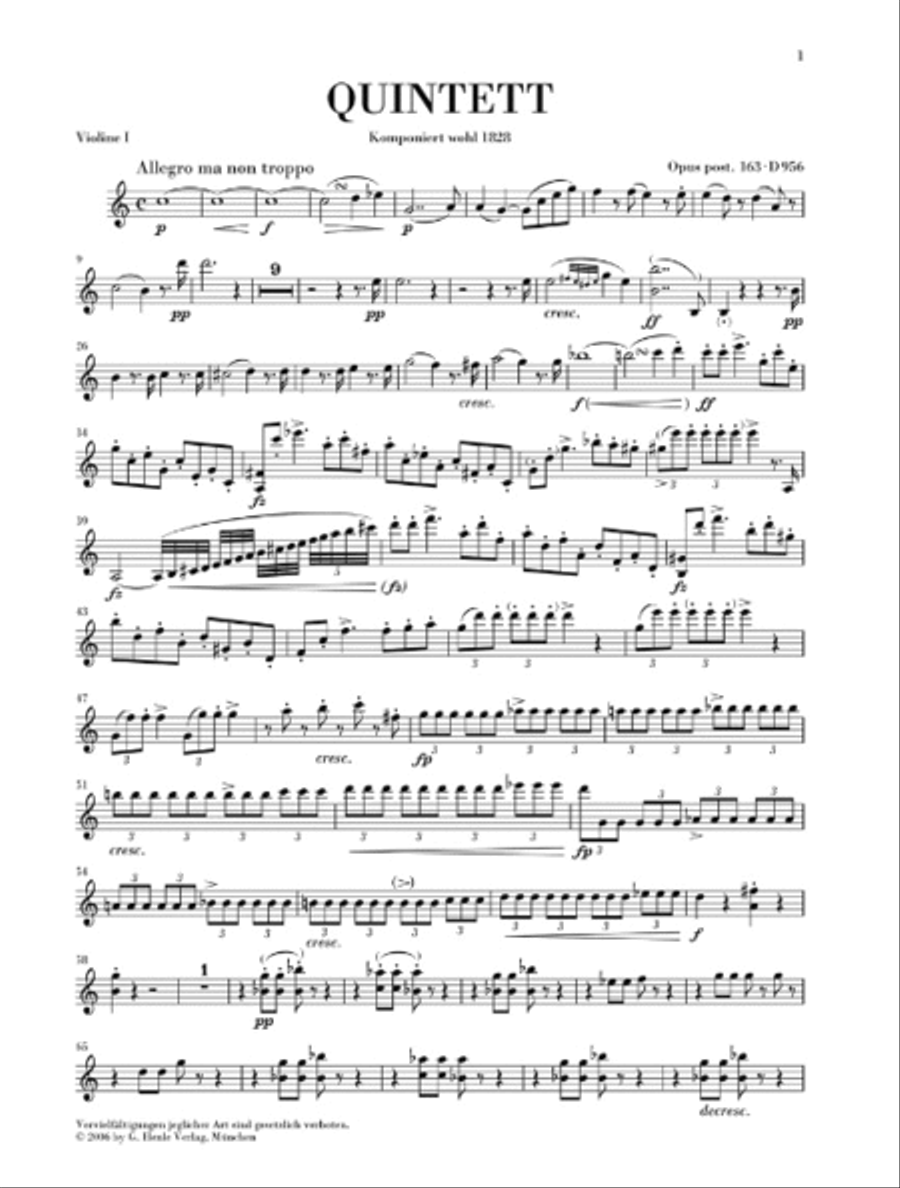 No music lover can remain untouched by the emotional quality of this work, composed in Schubert's last year. The monumental weight of the outer movements, the intimate lyricism of the “Adagio”, as well as the unusual timbre ensure the uniqueness of this quintet. An additional cello, which takes on an essential melodic role, joins the classical string quartet. The editor of our new Urtext edition, Egon Voss, not only does justice to the difficult source situation; with new and convincing solutions for difficult page turns, he also takes into account the demands of musical practice.