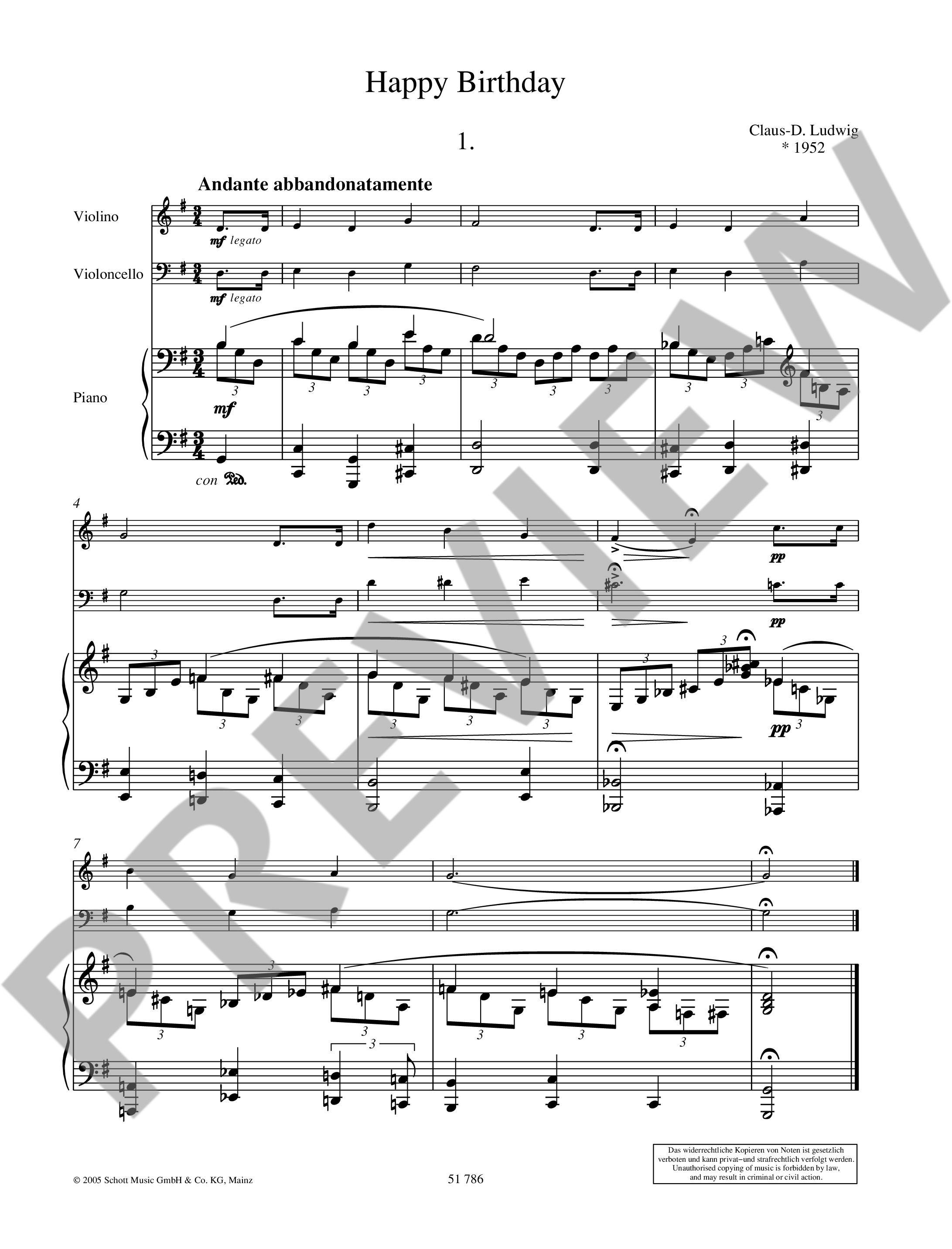 Claus-Dieter Ludwig의 아코디언 듀오(ED 8054) 또는 현악 4중주(ED 7717)를 위한 두 손(ED0 9748) 및 네 손(ED0 9749) 피아노용 생일 축하 메뉴는 잘 알려져 있으며 매우 인기가 있습니다. 이제 성공적인 편곡자는 바이올린, 첼로, 피아노를 위한 새로운 버전을 선보입니다.
