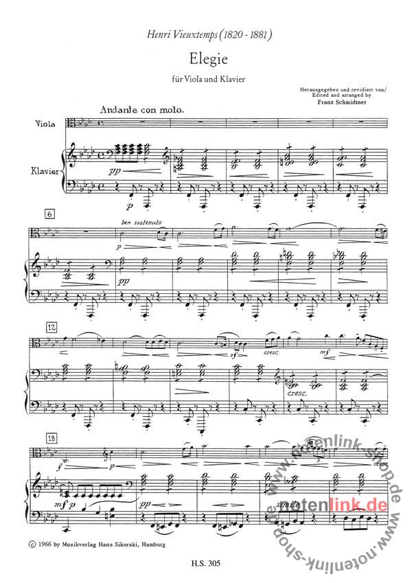 Elegy Op.30 is a beautiful work for Solo Viola, composed by Henri Vieuxtemps (1820-1881), which has been edited and arranged with Piano Accompaniment by Franz Scmidtner. This piece will provide an enjoyable challenge forthe advancing viola player.