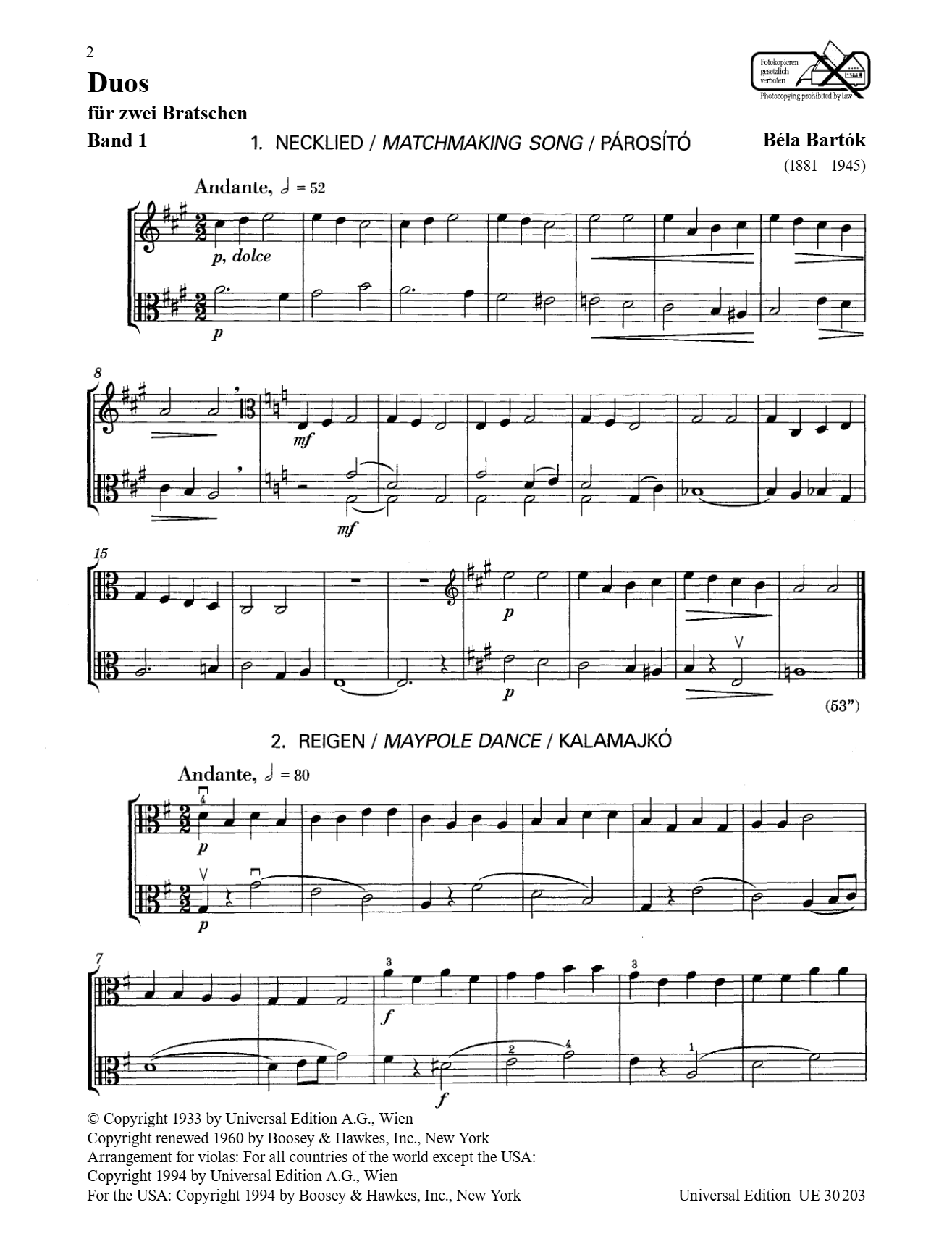aus den "44 Duos fur 2 Violinen" - for 2 Violas