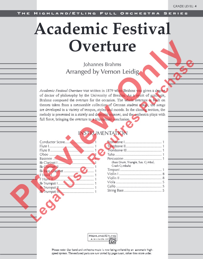 Brahms Academic Festival Overture for Orchestra (Score and Parts) (arr. Vernon Leidig)