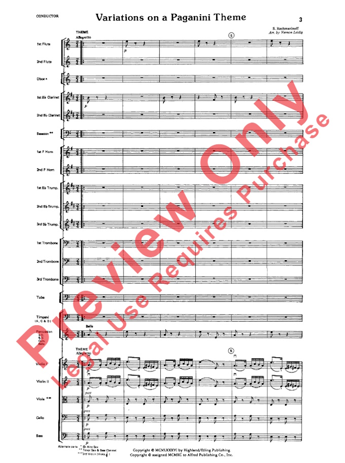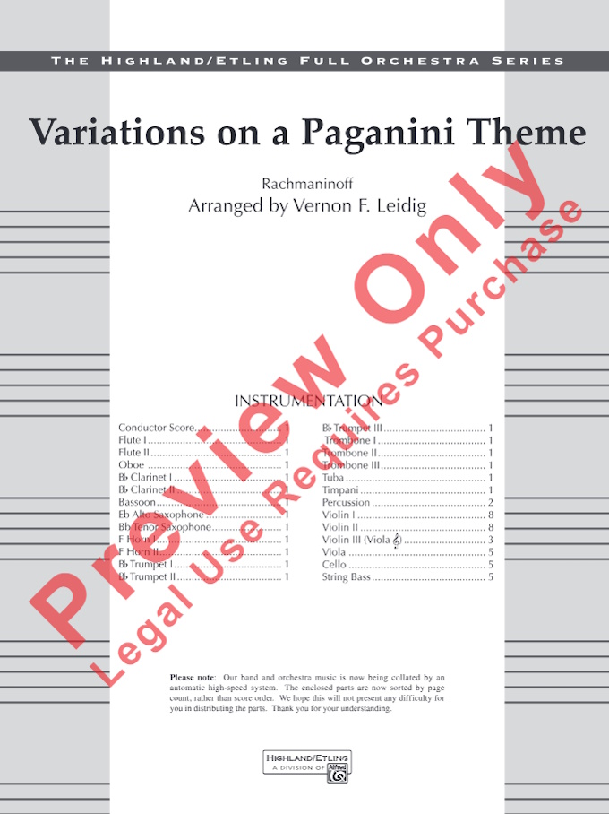 Rachmaninoff Variations on a Paganini Theme for Full Orchestra (Score and Parts) (arr. Vernon Leidig)