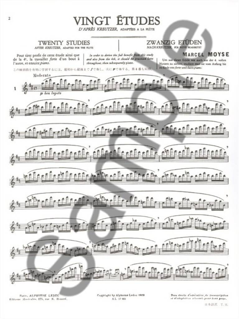 French flautist, Marcel Moyse (1889-1984) studied at the Paris Conservatoire before becoming a renowned performer on the instrument. He was also responsible for training a brilliant generation of flute players and his experiencesand expertise combined created the well-informed compilation, 20 Studies After Kreutzer for Flute. With notes in French, English, German and Japanese, Moyse's studies are accessible and versatile. Focus in this Moyse study book isgiven to fingering, phrasing, tempo, breath control, articulation, intervals, range, and ornamentation, among other musical aspects. 20 Studies for Flute, based on violin studies by Rodolphe Kreutzer, (1766-1831) is essential tothe technical progress of advanced flautists.