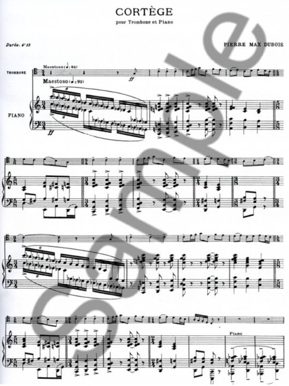프랑스 작곡가 피에르 막스 뒤부아(1930-1995)는 관악기 레퍼토리에 지대한 공헌을 했습니다. 1959년에 출판된 『트롬본과 피아노를 위한 행렬』은 이 고급 트롬본 연주자의 레퍼토리에서 여전히 중요한 위치를 차지하고 있습니다. 뒤부아의 음악은 특유의 경쾌함과 독특한 화성적, 선율적 질감을 자랑합니다. 『트롬본과 피아노를 위한 행렬』은 뒤부아의 작곡적 특징과 함께 제목에서 드러나듯 웅장한 요소들을 반영합니다. 일반적인 연주는 약 4분 15초 동안 진행됩니다. 『행렬』은 고급 트롬본 연주자의 레퍼토리에 필수적인 요소입니다. 뒤부아의 작품은 연주자와 관객 모두에게 흥미진진하고 즐거운 연주를 선사합니다.