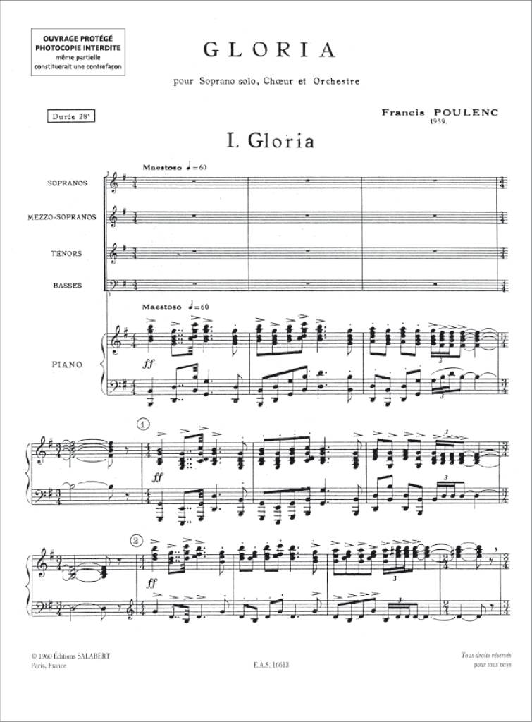 Francis Poulenc's 6 movement Gloria for Soprano and Mixed Choir with a Piano reduction of the original orchestral material.