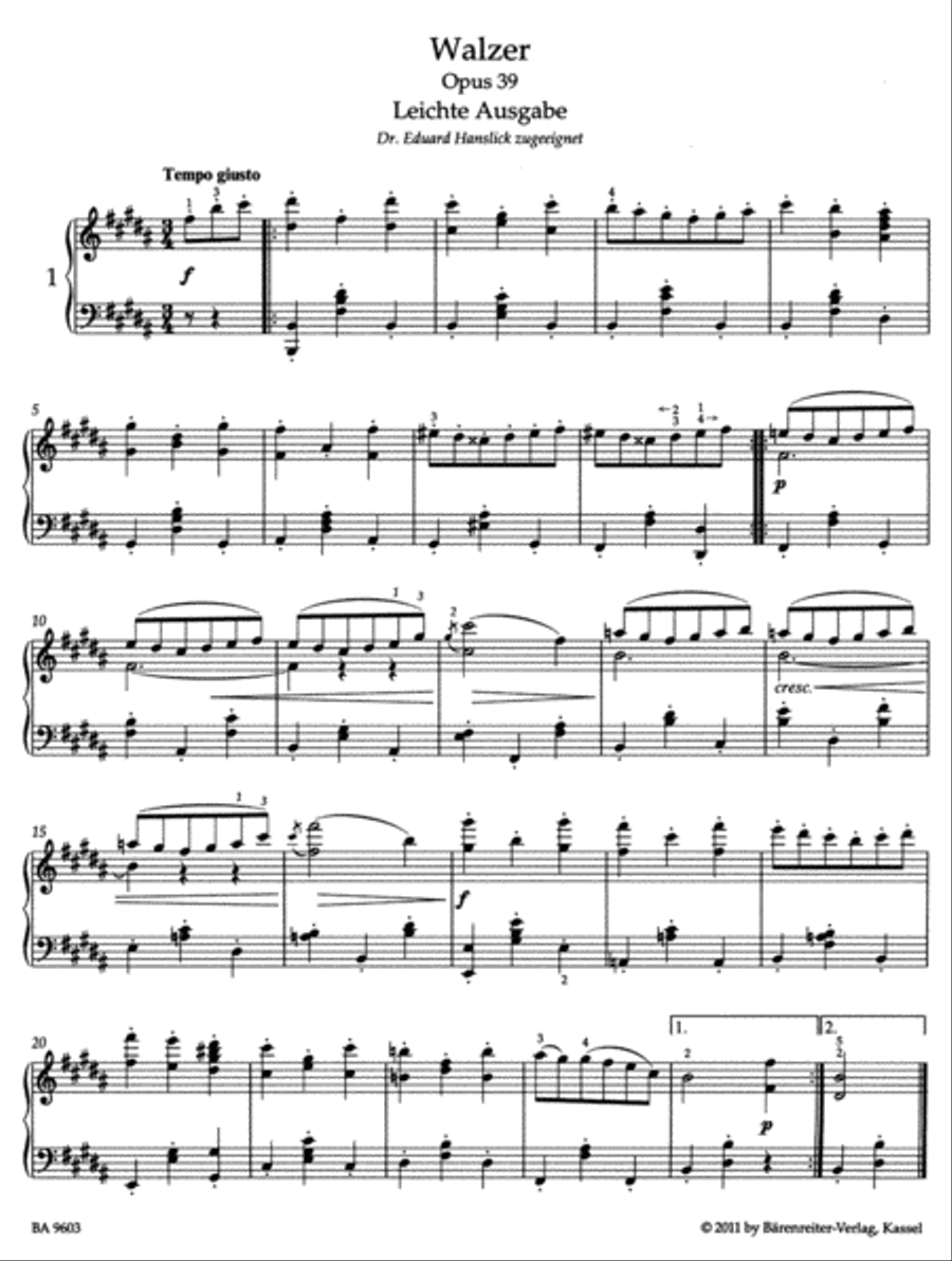 작품번호 39번 왈츠 두 버전(BA 9602, BA 9603)은 각각 별도의 악보로 출간되어 있으며, 학술적 비평에 기반한 원전 악보를 제공하는 베렌라이터 출판사의 브람스 작품 시리즈에 중요한 기여를 하고 있습니다. 두 판본 모두 운지법, 보기 좋게 구성된 악보 레이아웃, 최적의 페이지 넘김 기능을 제공합니다. 원전 악보에는 브람스가 사용했던 연주 관행에 대한 설명, 작품의 기원, 출처 및 중요성에 대한 유익한 서문, 그리고 주요 자료에 대한 해설이 함께 수록되어 있습니다.