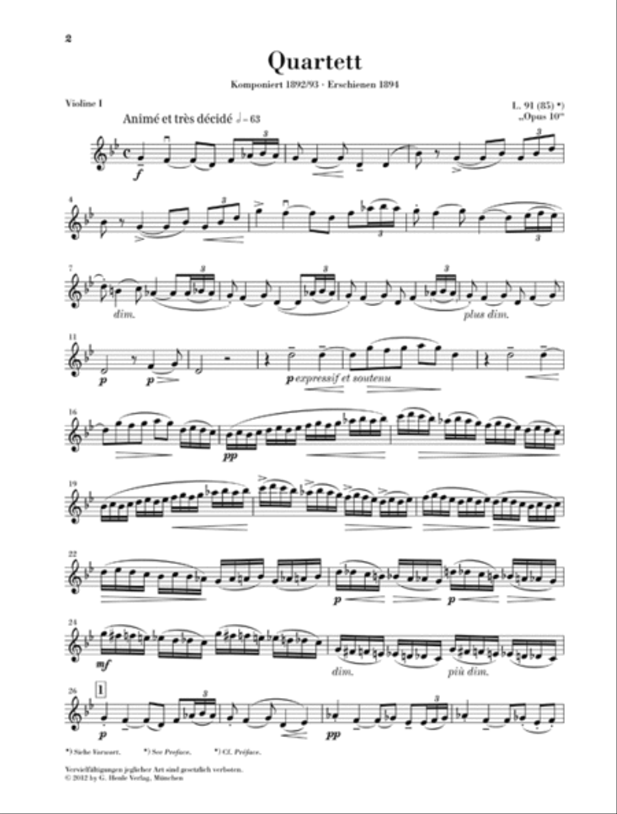 드뷔시의 새로운 현악 사중주는 1893년 12월 파리에서 초연되었을 때, 유명한 사중주 이자이가 연주하여 매우 냉담한 반응을 얻었습니다. 비평가들은 이 곡의 독특한 화성과 오케스트라 사운드에 불만을 표했고, 나중에 이 곡을 접한 연주자들은 "연주할 수 없다"고 생각했습니다. 그럼에도 불구하고 이 작품은 그 후 몇 년 동안 자리를 잡았고 오늘날 핵심 실내악 레퍼토리로 자리 잡았습니다. 이 작품은 1894년 "1er Quatuor"라는 제목으로 출판되었는데, 이는 작곡가가 당시 적어도 비슷한 작품을 또 작곡할 생각을 하고 있었음을 보여줍니다. 하지만 그는 결코 이 약속을 지키지 못했습니다.