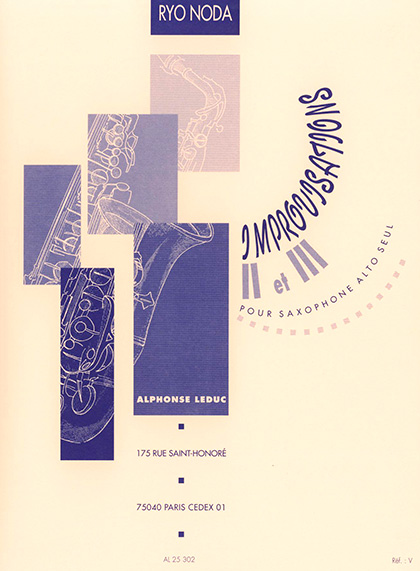 Improvations by Ryo Noda는 솔로 알토 색소폰 2 곡 세트입니다. Jean Marie Londeix에게 헌정 된 2 페이지 이상의이 부분은 플레이어에게 즉석의 자유를주기 위해 작성되었습니다. 이 악보는 즉석 2와 3 만 제공합니다. 즉석 1은 별도의 음량으로 존재합니다. Ryo Noda는 고전, 낭만, 바로크 등 모든 장르에서 경험이 풍부한 일본의 색소폰 연주자입니다. 그는 또한 즉석 작업으로 유명합니다.