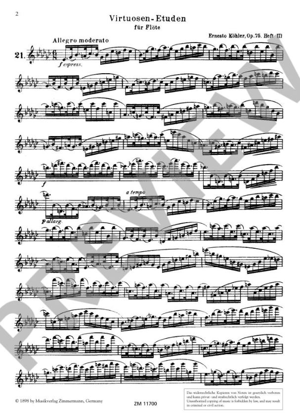 This collection of virtuoso etudes by ERNESTO KÖHLER (1849-1907) is technically very demanding, but also gives great joy of playing. The studies require a long flute practice, but precisely for this reason, the studies exert a tremendous fascination. Hardly any flutist who has not tried to come through them.