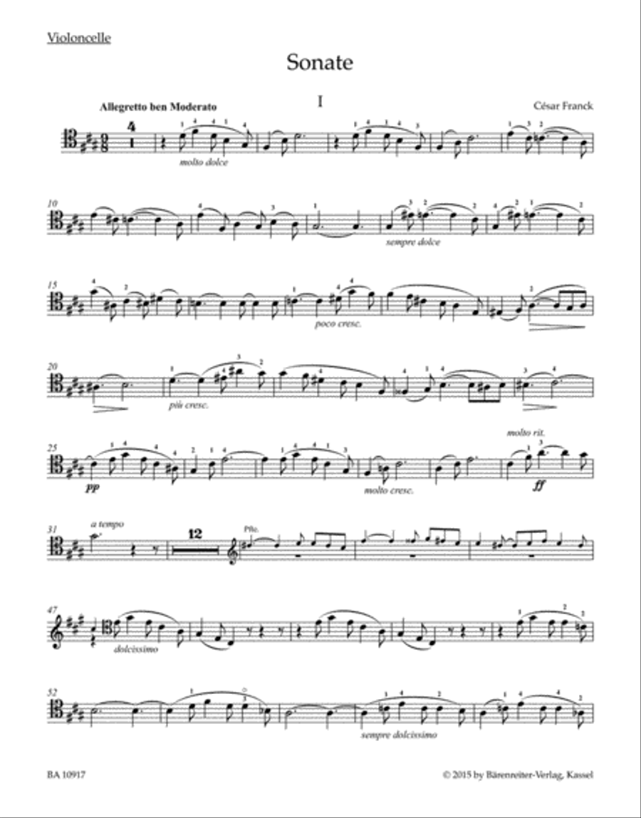 Franck’s friend, the cellist Jules Desart, was so impressed when he heard the Violin Sonata performed at the Société nationale de musique in Paris that he adapted the work for his instrument. This arrangement was first published in 1887 by inserting the cello part into the piano score of the original edition. For this purpose the piano score had received a new cover and the publisher had expanded the title of the composition to “Sonate pour piano et violon ou violoncelle”. This version by the cellist Jules Delsart for piano and violoncello is the only arrangement of the work authorized by the composer and its first edition represents the main source for Bärenreiter’s new scholarly-critical publication.