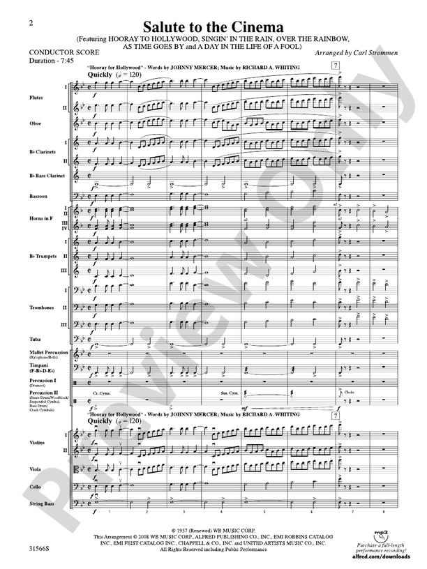Along with Broadway shows, the cinema has given us some of the most memorable great American standards. What more fitting opener and closer to this dazzling arrangement than "Hooray for Hollywood." In between we have "Singin` in the Rain," "Over the Rainbow," "As Time Goes By" and "A Day in the Life of a Fool." Perfect for advanced or community orchestras!