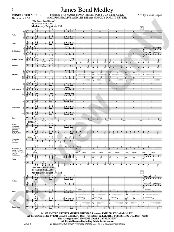 In his James Bond Medley arrangement, Victor Lopez shows that the 007 agent is alive and well. The medley features five classic hits, the "James Bond Theme," "For Your Eyes Only," "Goldfinger," "Live and Let Die," and "No Body Does It Better." Although this arrangement is written for intermediate full orchestra, it has been scored in such a way that it will also sound as effective with strings only. Careful considerations have been given to tonality and rhythmical issues as related to the strings. Bowings have also been included to facilitate playability. For more additional flexibility, solo parts have been cued throughout. With solid scoring, adequate ranges and classic selections, this James Bond Medley is a sure winner! (9:23)